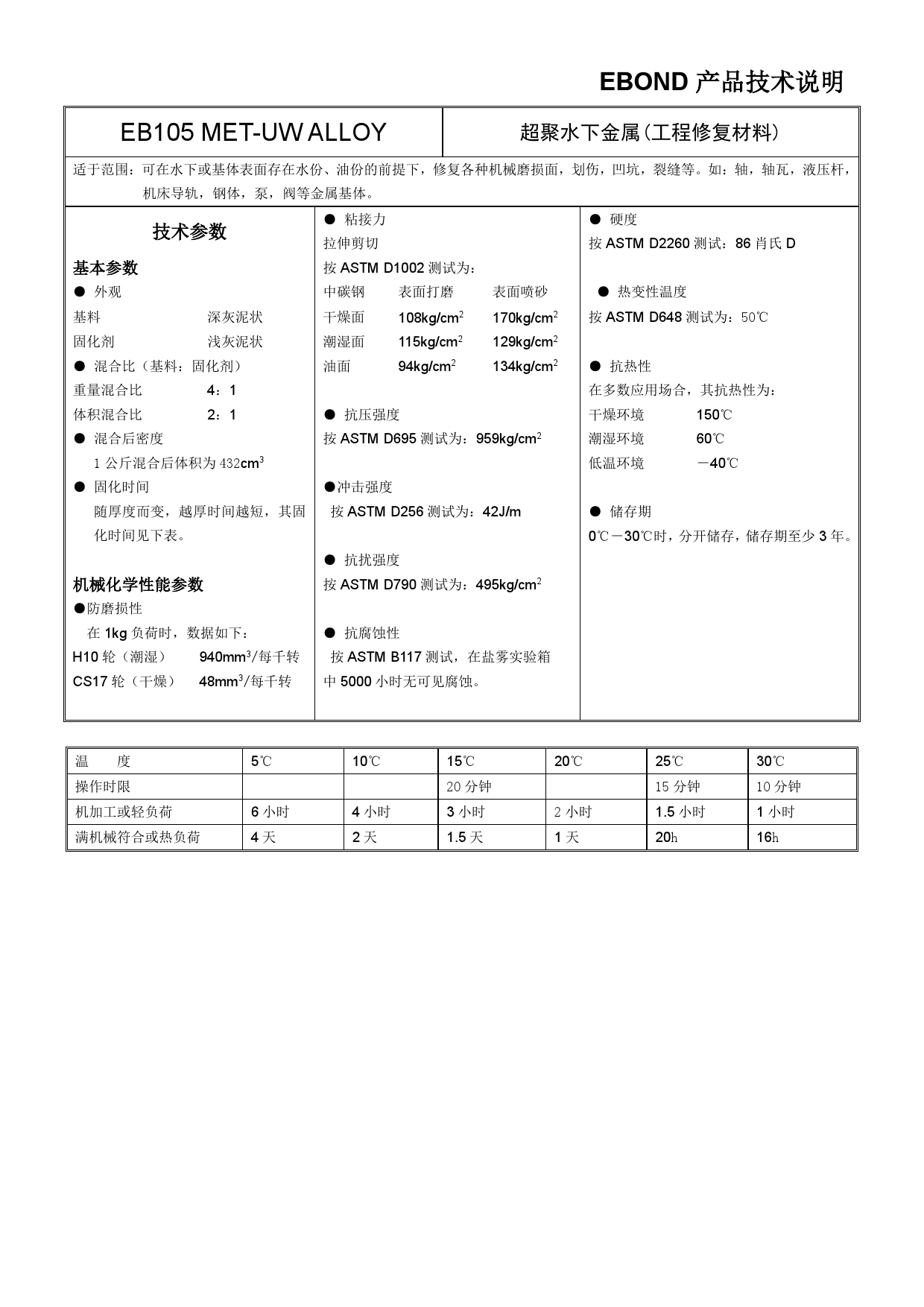 EB105是一种将高分子聚合物与硅钢合金混合并以此为基础构成的金属表面修复及重建的双组份系统。固化后,系统经久耐用且可进行车加工。本材料可在水中固化,可用于水下作业或者在基体表面存在水份、油份的前提下,修复设备的磨损面。