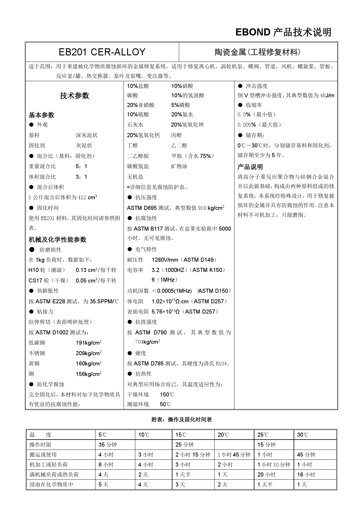 EB201是由高分子聚合物、合金粉末与耐磨陶瓷粉末为基材并配以固化剂的双组份复合材料。该材料不含溶剂,固含量100%,固化后不收缩,广泛用于金属工件、泵壳、叶轮等抗固、流体冲刷撞击而引起的磨蚀和腐蚀的修补,如离心机、涡轮机泵、阀、管板、热交换器、叶轮等。