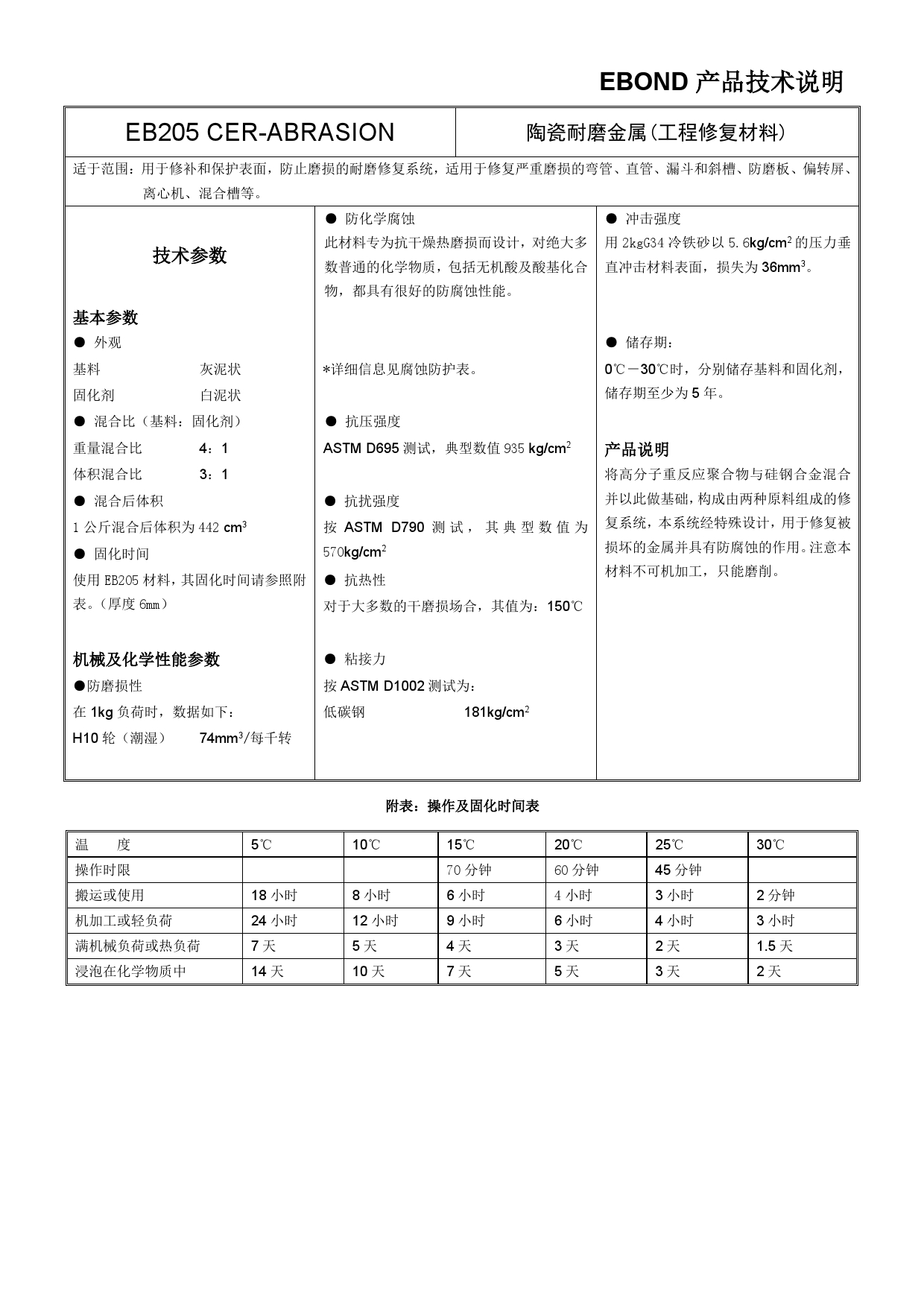 EB205是由高分子聚合物、合金粉末与耐磨陶瓷颗粒为基材,并配以固化剂的双组份复合材料。EB205为修复材料,混合后呈泥状,系统固化后具有极强的抗固体颗粒或泥浆的磨损性能,同时还具有优异的抗化学腐蚀性能,适用于修补严重磨损部位,如管道弯头、料斗、泥浆泵等。