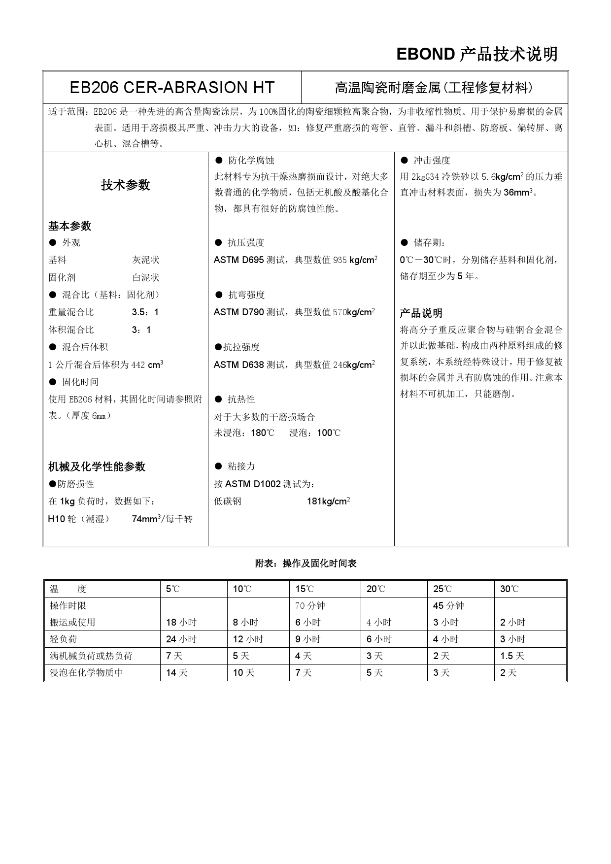 EB206是由高分子聚合物、合金粉末与耐磨陶瓷颗粒为基材,并配以固化剂的双组份复合材料。EB206具有较好的耐高温性能,混合后呈泥状,系统固化后具有极强的抗固体颗粒或泥浆的磨损性能,同时还具有优异的抗化学腐蚀性能,适用于修补严重磨损且温度较高的部位,如管道弯头、泥浆泵等。
